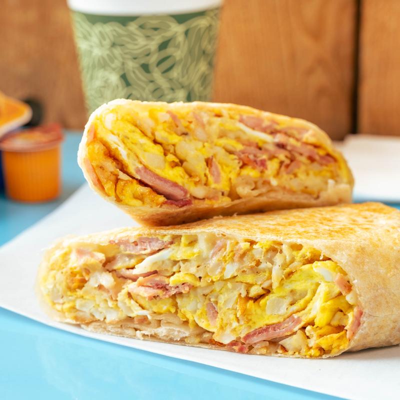 Made with hashbrown, egg, cheese, and a choice of meat: Chicken, Chorizo, Ham, Sausage, Bacon, or Veggie.